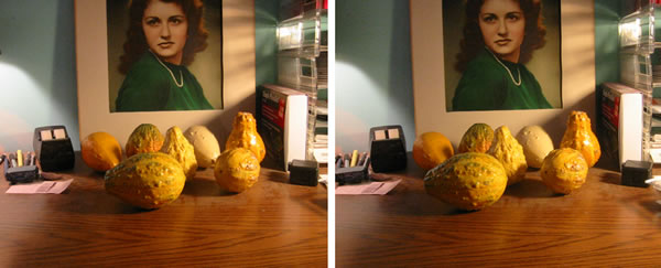 An example of a stereo pair. If you cross your eyes until the front gourd on the right merges with it's couterpart on the left and hold them in that position for a few seconds the images should merge and you will be able to percieve some measure of the depth of the original scene. If you're having trouble, vary your distance from the screen and/or tilt your head slightly to one side or the other. Here's another example.